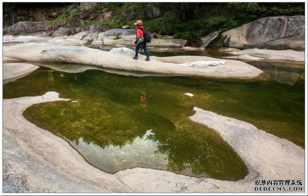 首先,来到半月形堰口,身旁的一汪碧潭似乎浅了不少,溪水留在堰口凹陷处,象一片片平整的玻璃镜面,将天光云影都搅入它的怀中。没有了想象中丝丝亮亮的小瀑布。此时心里嘀咕着,哎呀,来的不是时候。踏着一块块排列整齐的脚踏石带着思绪步入那个神秘莫测的峡谷中!