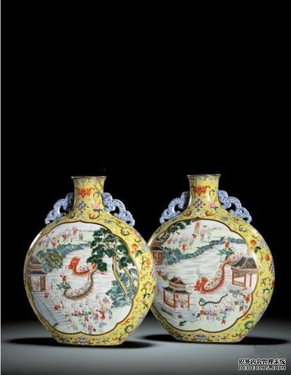 清乾隆 黄地轧道锦纹粉彩开光式“婴戏龙舟”图螭龙耳扁壶